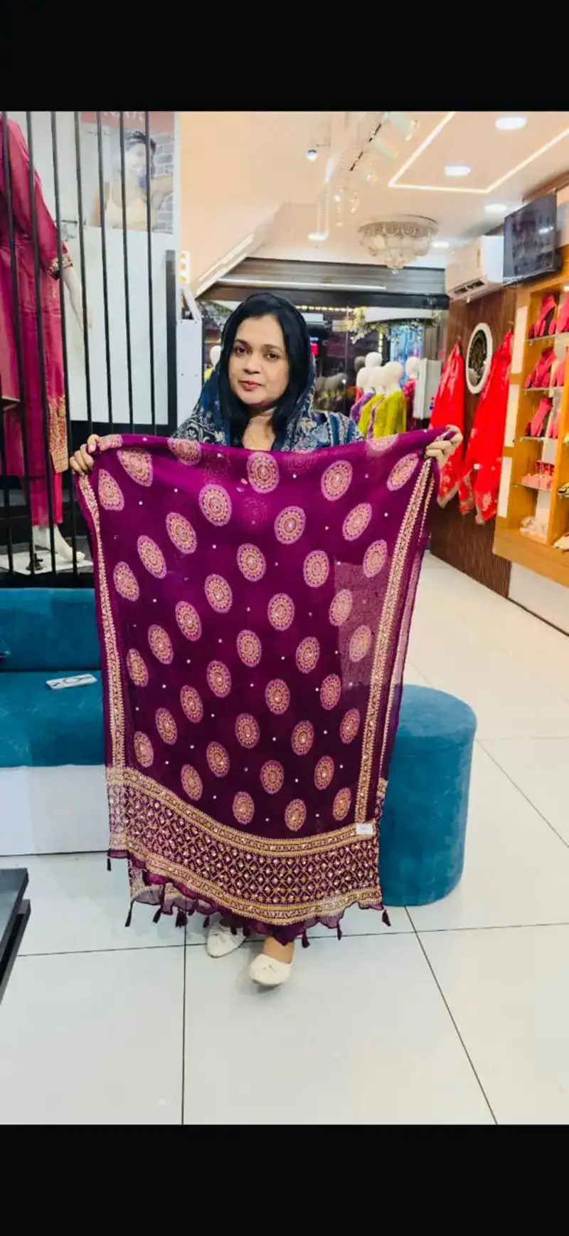 Lightweight and elegant georgette crushed dupatta featuring intricate embroidered circular motifs and a rich decorative border. Perfect for festive wear, casual styling, and ethnic layering.