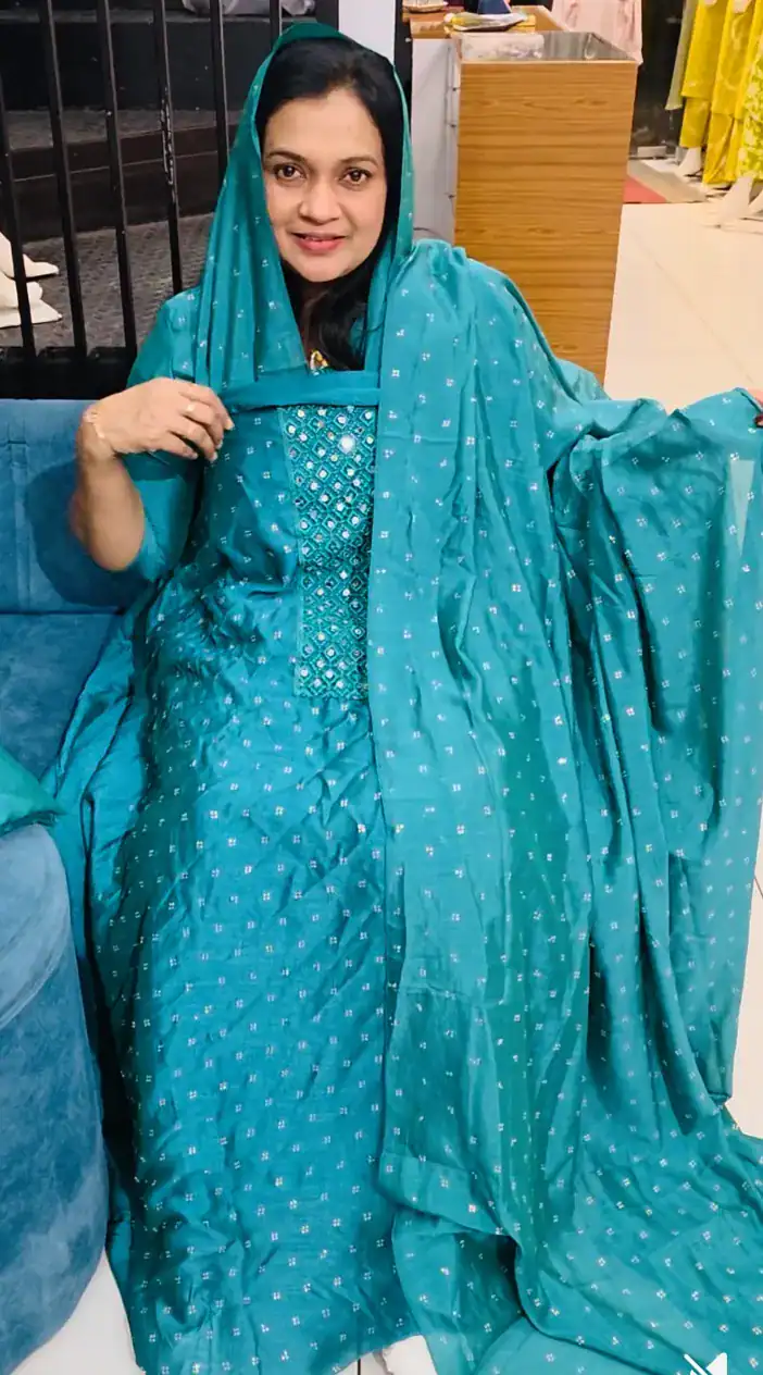 Elegant semi-silky unstitched churidar set featuring delicate all-over embellishments with a beautifully detailed neckline panel. Paired with a matching dupatta, this lightweight and graceful fabric is perfect for festive wear, casual gatherings, and elegant everyday styling.